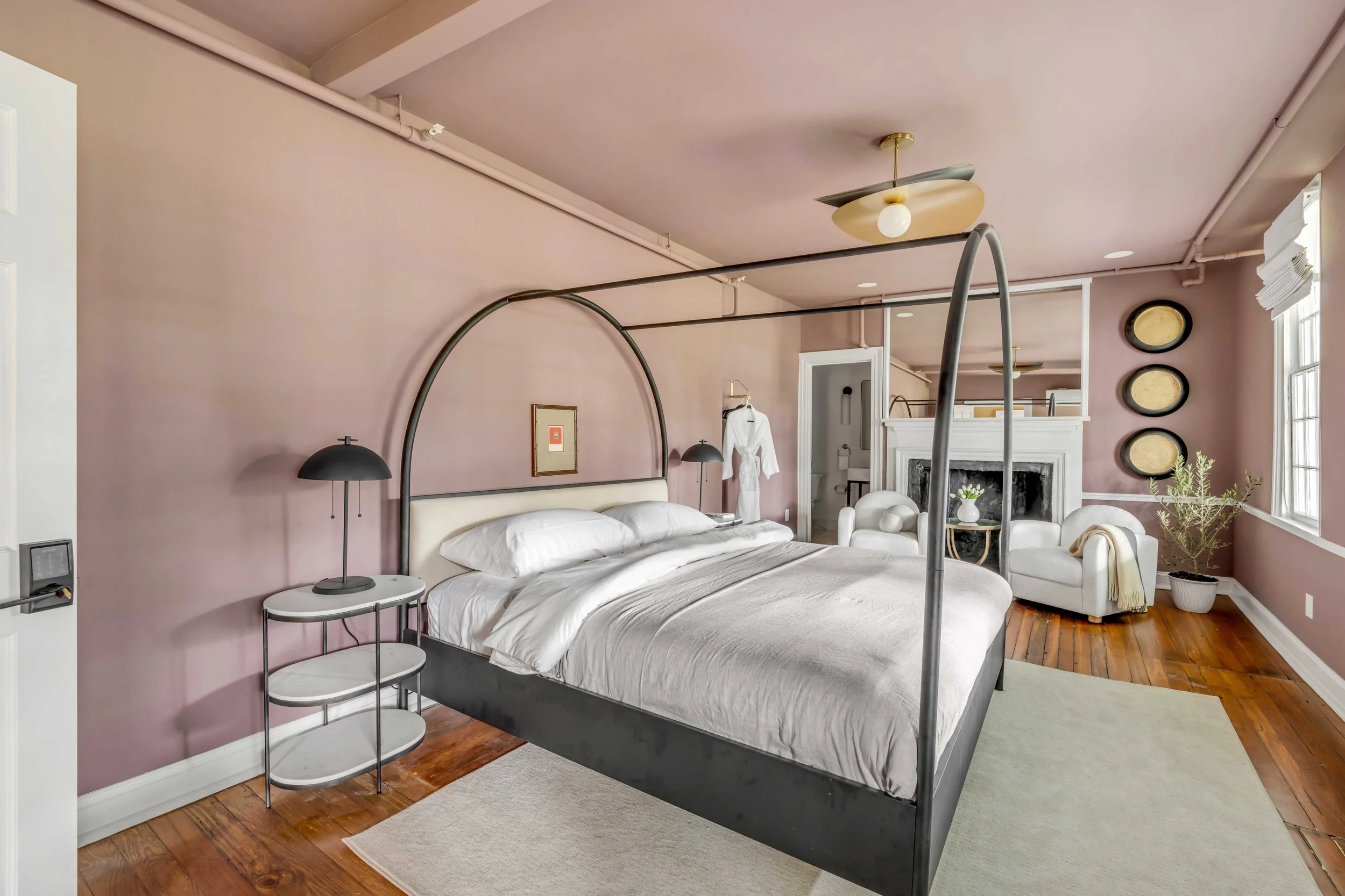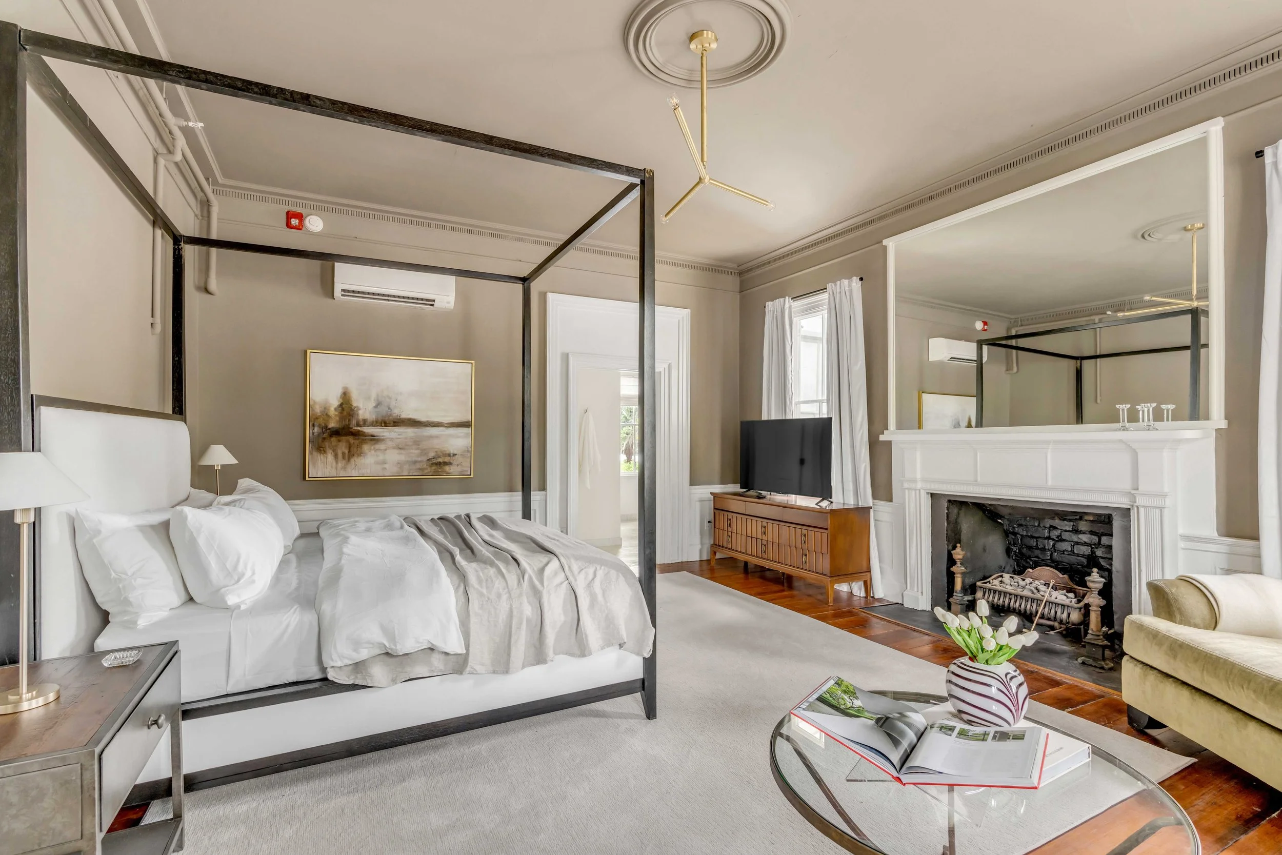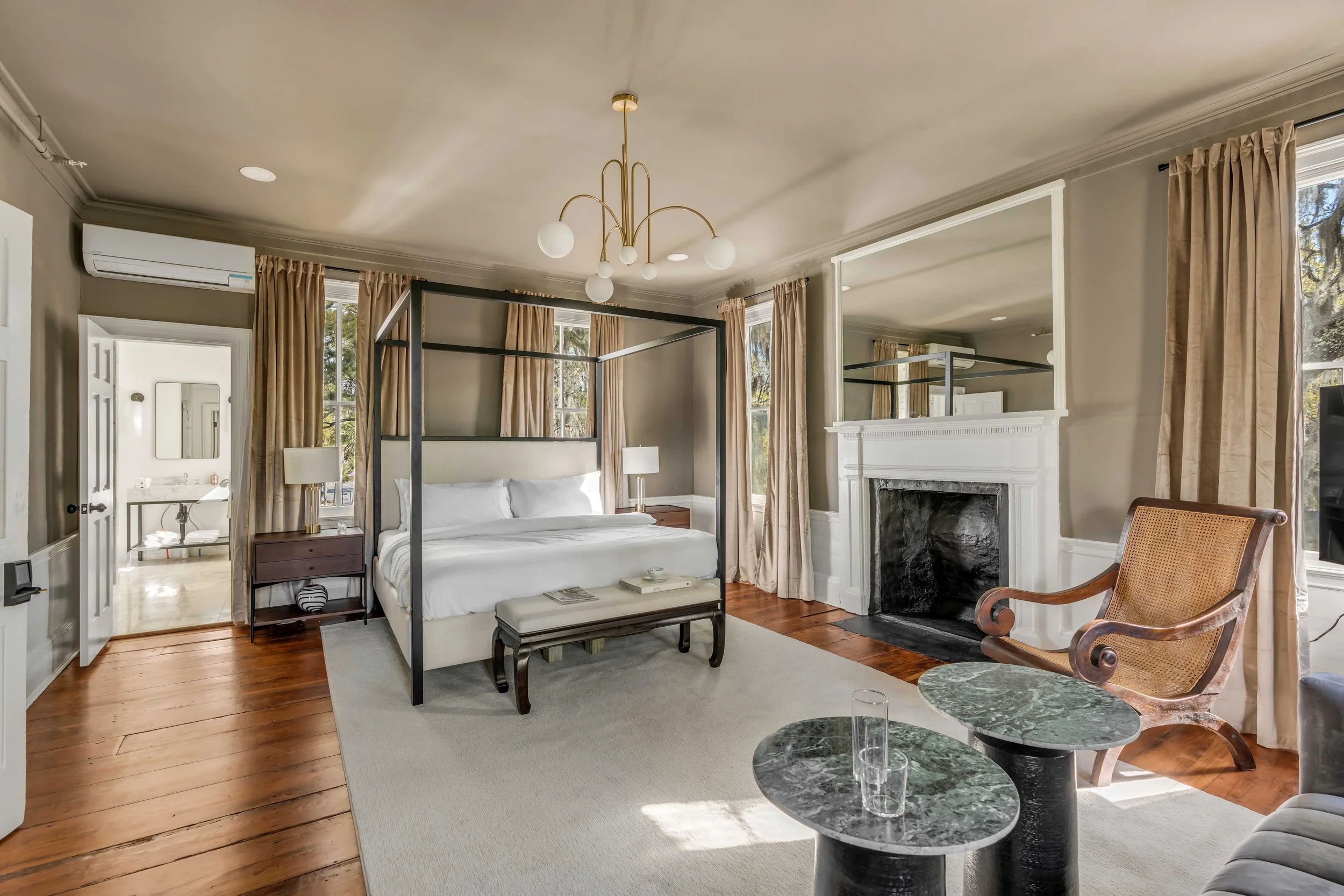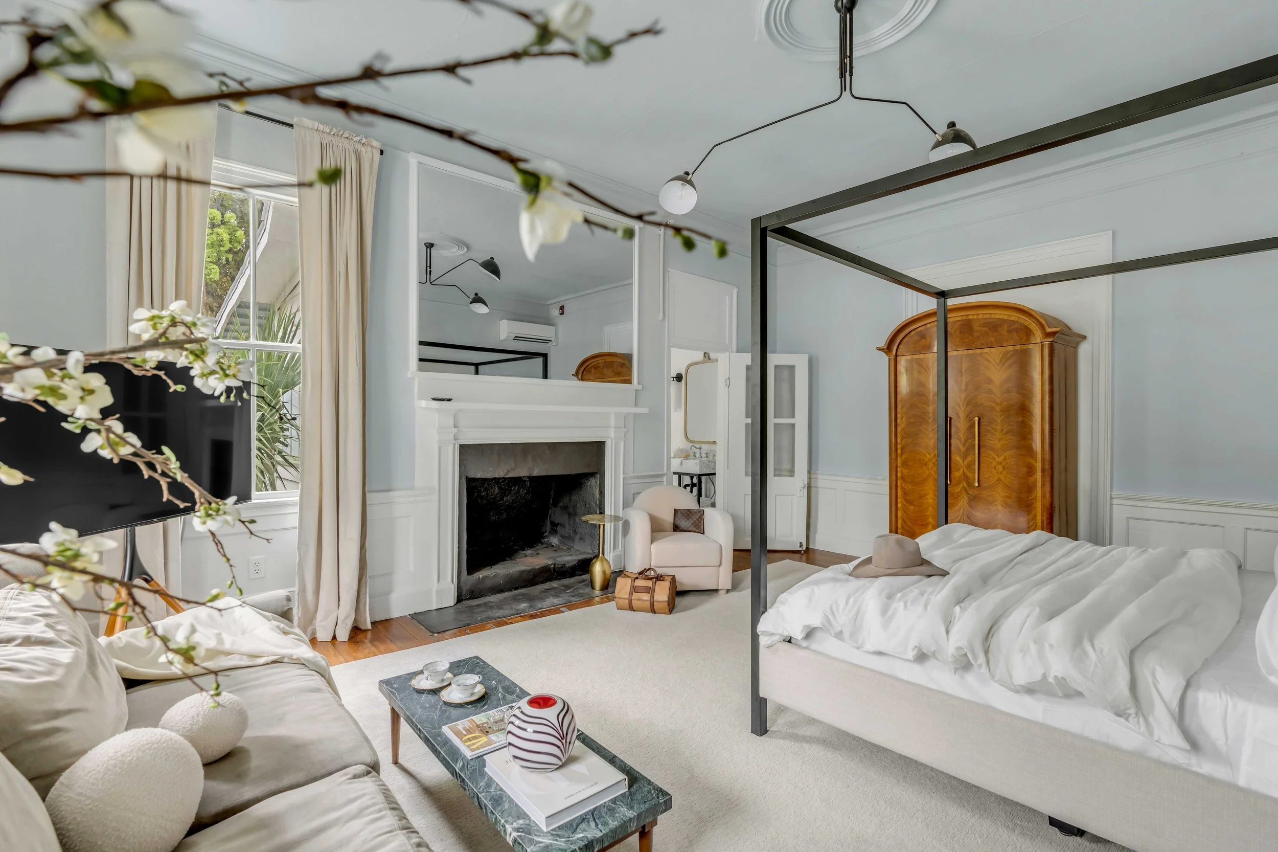 Each suite features restored hardwood floors, decorative fireplaces, tall ceilings, king canopy beds, and elegant marble bathrooms with rain showers. Original plaster walls preserve the home’s rich character while offering a warm, inviting atmosphere.